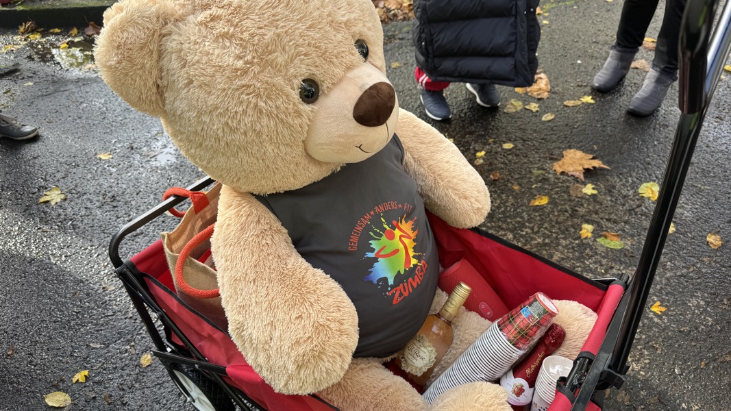 Auf der Runde durch die Kleingartenanlage wurde natürlich auch eine kleine Pause eingelegt – mit allem, was das Herz begehrt: Sekt, Baileys, Amaretto und viel Gelächter. Und dann noch ein Highlight: Die feierliche Taufe des neuen Zumba-Maskottchens „Zumbarino“ – ein Moment für die Geschichtsbücher!